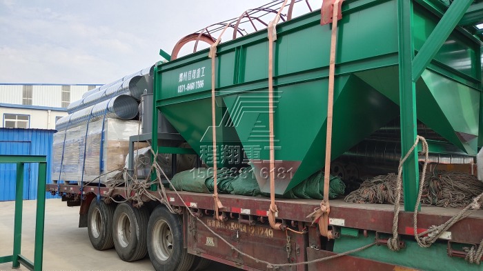 由于該豬糞秸稈有機(jī)肥料生產(chǎn)線產(chǎn)量較大,因此分為多車裝置運(yùn)輸。主要的豬糞加工設(shè)備有:大型秸稈粉碎機(jī)、履帶式翻堆機(jī)、臥式攪拌機(jī)、新型三合一造粒機(jī)、不同型號(hào)的滾筒篩分機(jī)以及多個(gè)型號(hào)的烘干冷卻設(shè)備。滾筒烘干設(shè)備風(fēng)頭以及風(fēng)機(jī)安置熱風(fēng)爐以及冷卻設(shè)備多個(gè)烘干冷卻設(shè)備履帶式翻堆機(jī)以及大型秸稈粉碎機(jī)二次烘干設(shè)備滾筒篩分機(jī)以及鏟車喂料倉(cāng)本次豬糞秸稈有機(jī)肥料生產(chǎn)線工藝設(shè)計(jì)流程為:利用大型秸稈粉碎機(jī)將稻草秸稈等粉碎均勻,