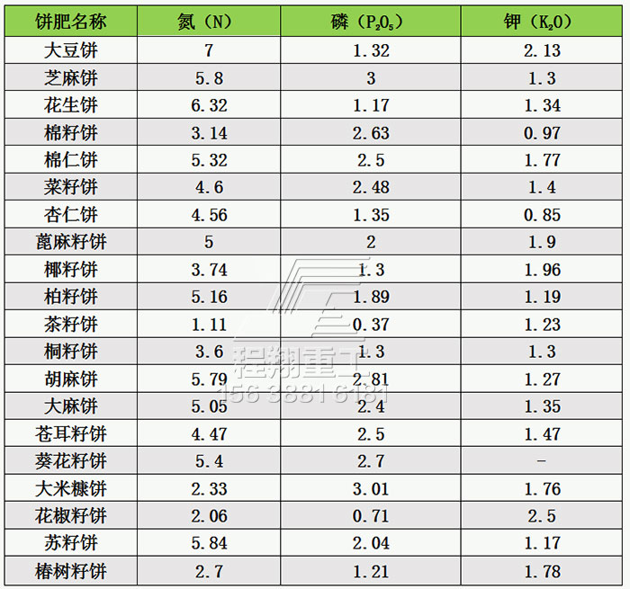 餅肥的成分與性質(zhì)   餅肥含氮1.11%-7.00%、五氧化二磷0.37-3.00%、氧化鉀0.85%-2.13%、有機(jī)質(zhì)75%-85%,還含有蛋白質(zhì)及氨基酸、微量元素等。菜籽餅和大豆餅中還含有粗纖維6%-10.7%,鈣0.8%-11%,膽堿0.27%-0.70%,此外,還有一定數(shù)量的煙酸及其他維生素類物質(zhì)。不同餅肥的養(yǎng)分含量不盡相同,具體的可以參考下邊的表格圖片。