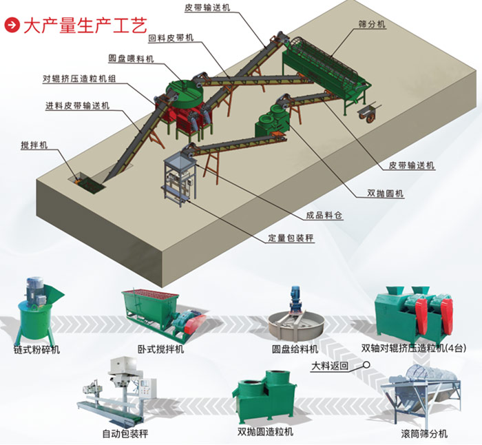生產(chǎn)顆粒鉀肥的主要設(shè)備是干粉造粒機(jī),主要配套設(shè)備包括強(qiáng)制喂料器(主料斗)、對輥軋片機(jī)組、機(jī)架平臺、破碎整粒機(jī)、多級篩分器、鏈板輸送機(jī)、臥式攪拌機(jī)等。