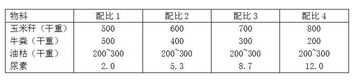 主要選擇資源豐富的軟質(zhì)作物秸稈和畜禽糞便為主,將物料的C/N比值盡可能調(diào)節(jié)到25:1。根據(jù)各地原料的差異,選擇下表中所列物料配比中的一種(其他秸稈和畜禽糞便可參照該比例)。油枯應(yīng)發(fā)酵結(jié)束前10 d左右按比例添加,均勻鋪在發(fā)酵堆上,通過(guò)利用臥式粉碎機(jī)將油枯與其他物料攪拌均勻,使用槽式翻堆機(jī)再堆制發(fā)酵。若加入油枯后堆溫超過(guò)60℃,應(yīng)即時(shí)翻堆,防止油枯炭化和氨化。