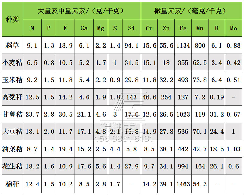 秸稈中含有大量的有機質和氮(N)、磷(P)、鉀(K)、鈣(Ca)、鎂(Mg)、硫(S)、硅(Si)、銅(Cu)、錳(Mn)、鋅(Zn)、鐵(Fe)、鉬(Mo)等營養(yǎng)元素,主要作物秸稈的營養(yǎng)元素含量見表1。